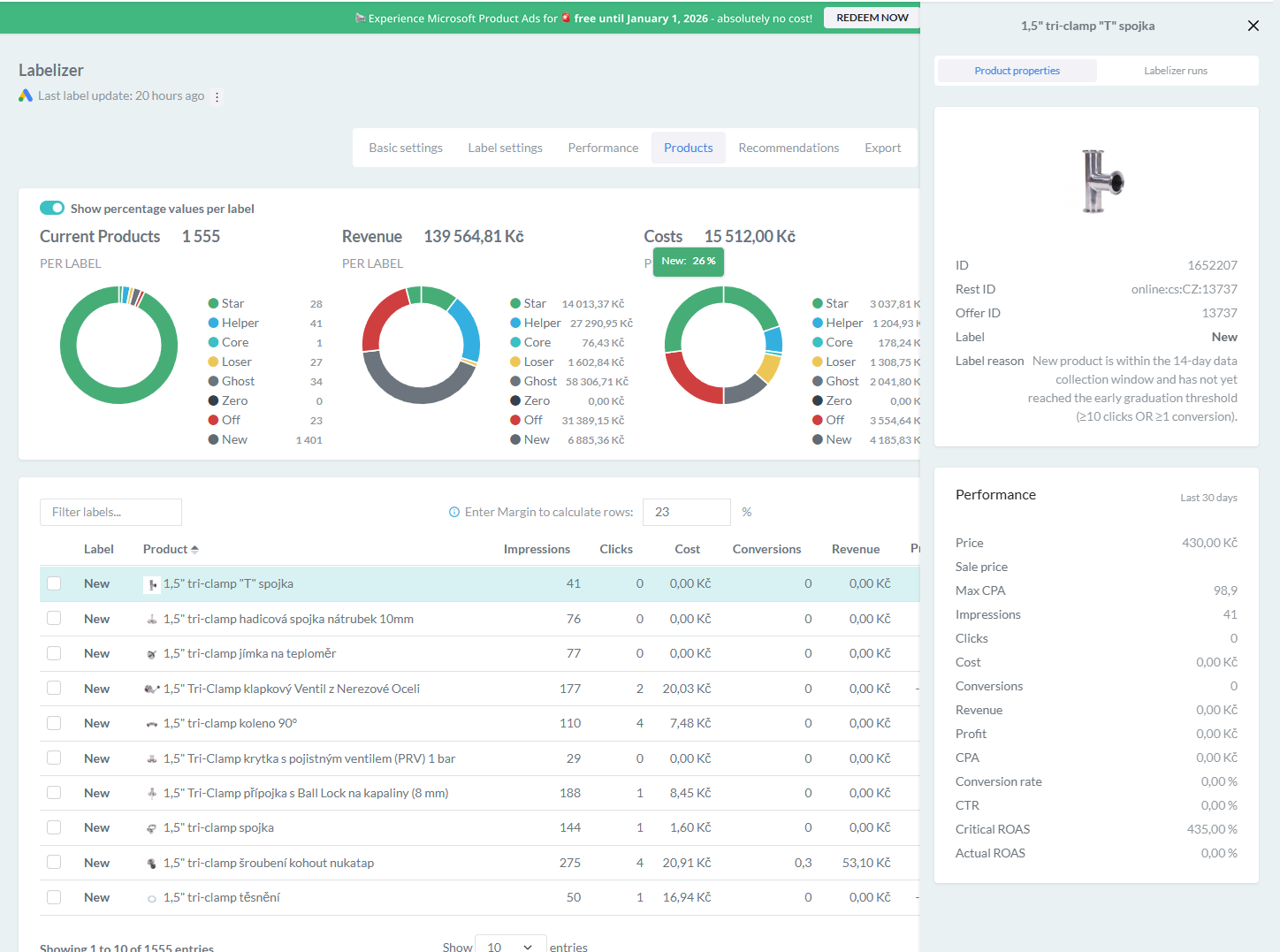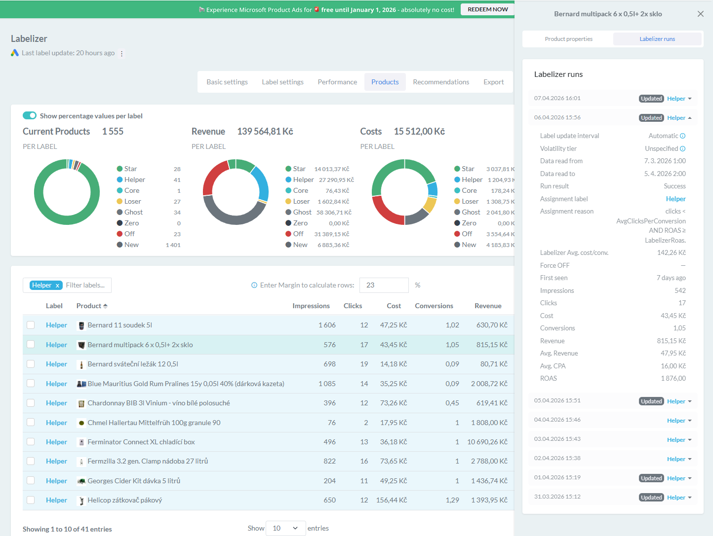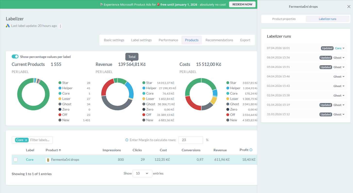 Trh sa mení a vy musíte reagovať rýchlo. Ak sa rozhodnete upraviť kľúčové nastavenia Labelizeru (napríklad upravíte Margin (%), Labelizer %ROAS, Average Clicks, Time frame alebo prepnete Use Zero label), už nečakáte.