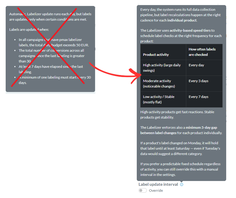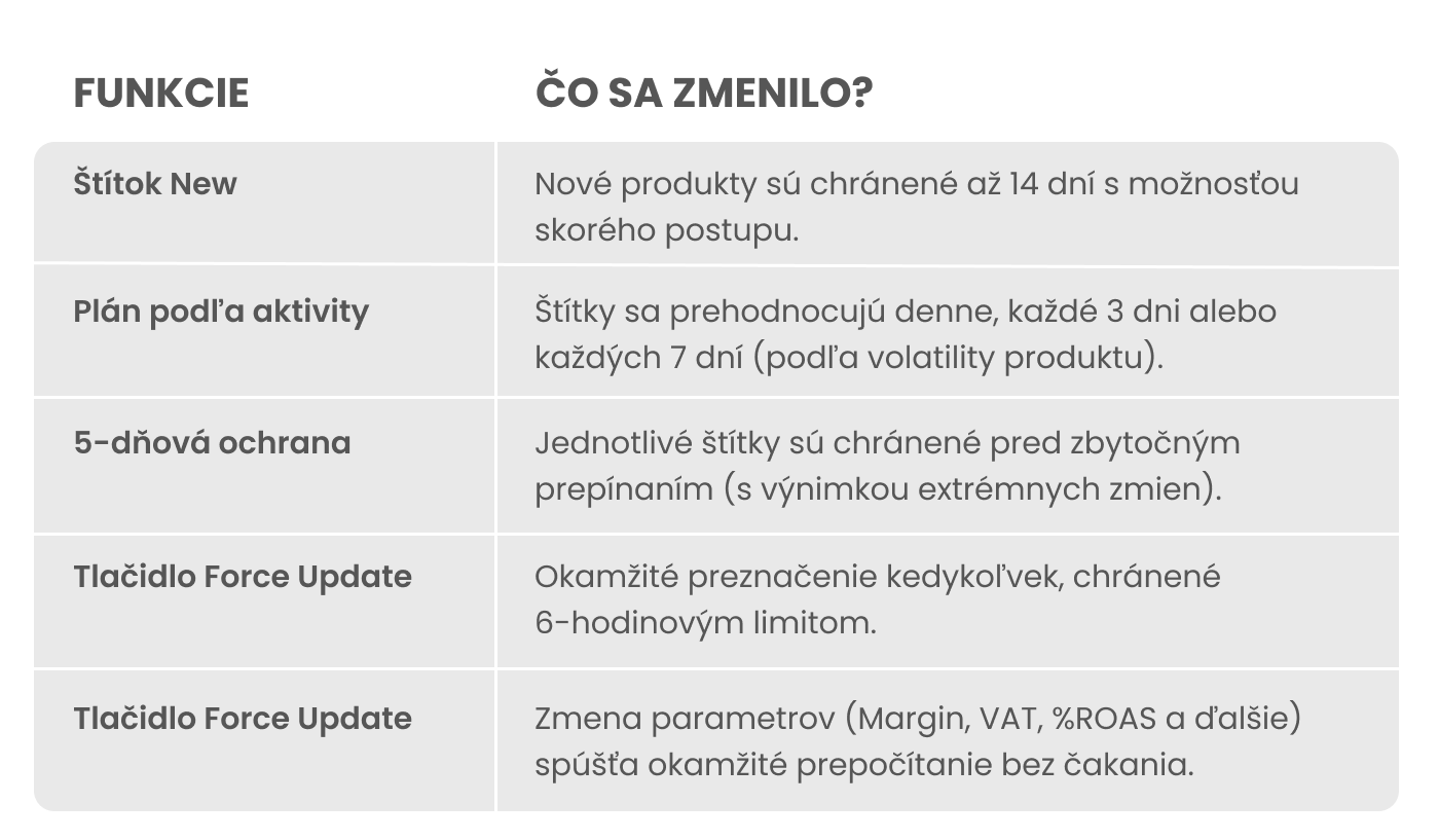 Odteraz už systém nečaká na „globálny“ signál celého portfólia. To, či produkt dostane nový štítok, závisí výhradne od jeho vlastného výkonu. Náš Labelizer naďalej beží vo svojom pravidelnom 24-hodinovom cykle, avšak zavádza plán aktualizácií podľa aktivity produktu: