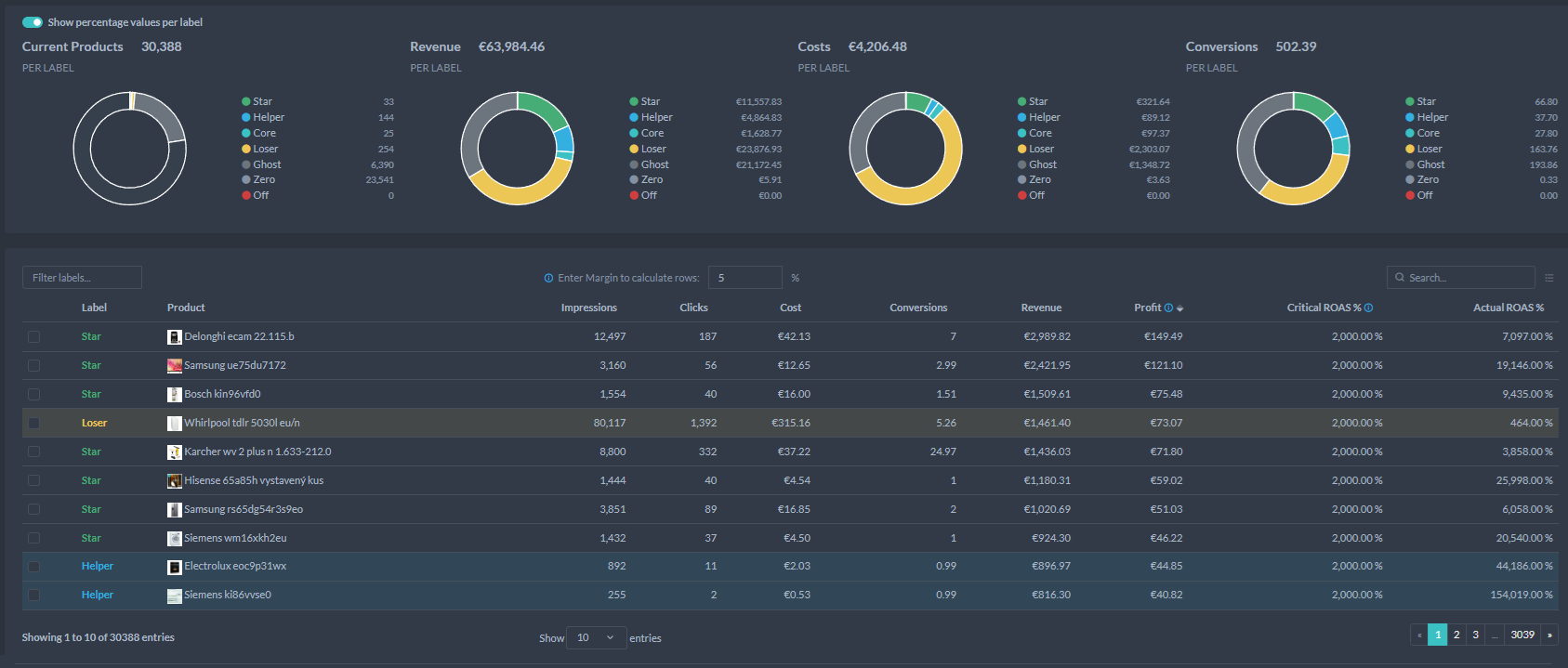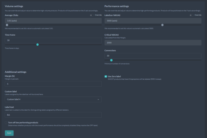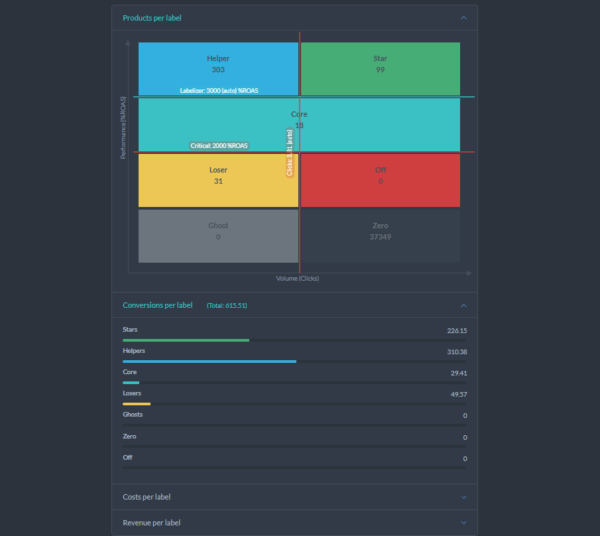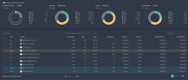 Labelizer identifikuje najlepšie produkty, podporuje slabšie výkonné a odstraňuje tie, ktoré nespĺňajú očakávania. Automaticky upravuje štítky produktov na základe ich výkonnosti, tak aby boli vaše kampane vždy optimálne.