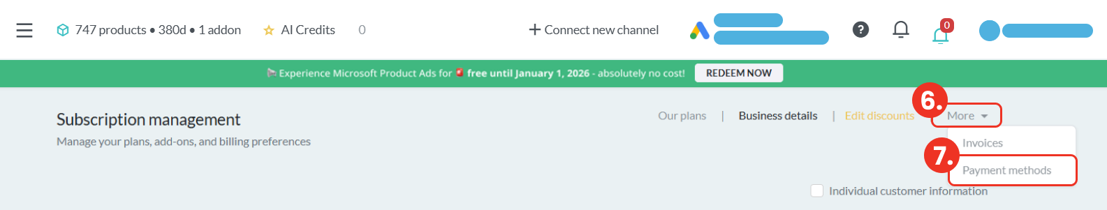 Po kliknutí sa dostanete do sekcie Subscription management, kde v pravej hornej časti vyberiete možnosť „Business details“ (krok 3).