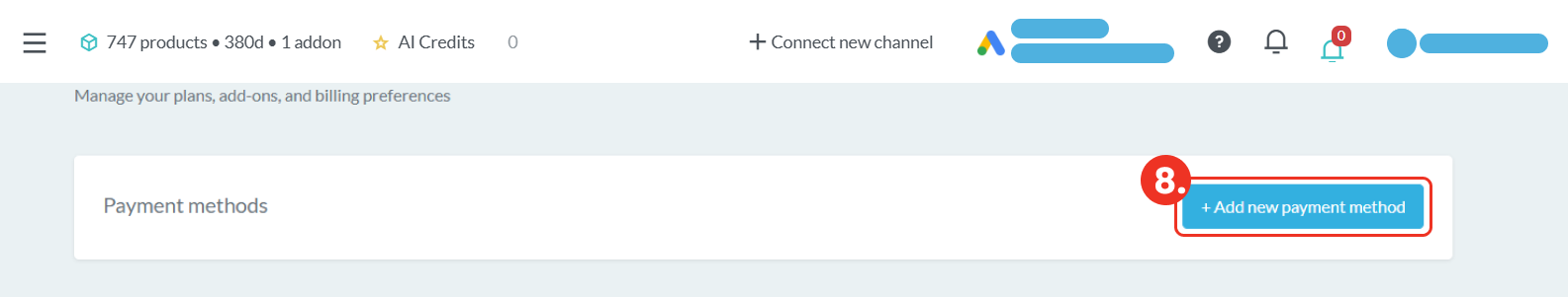 V nej kliknete na možnosť „+ Add new payment method“ (krok 8), kde doplníte potrebné údaje k platobnej metóde.
