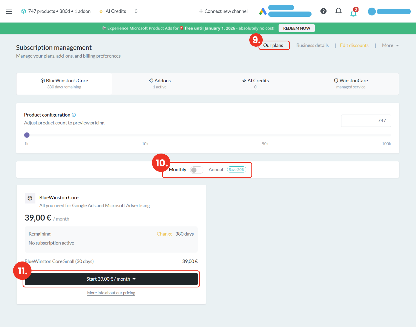 Po prihlásení do aplikácie BlueWinston je potrebné prejsť do sekcie fakturácie. Urobíte tak, že v pravom hornom rohu kliknete na váš účet (krok 1) a následne zvolíte možnosť „Manage your pricing plan“ (krok 2).